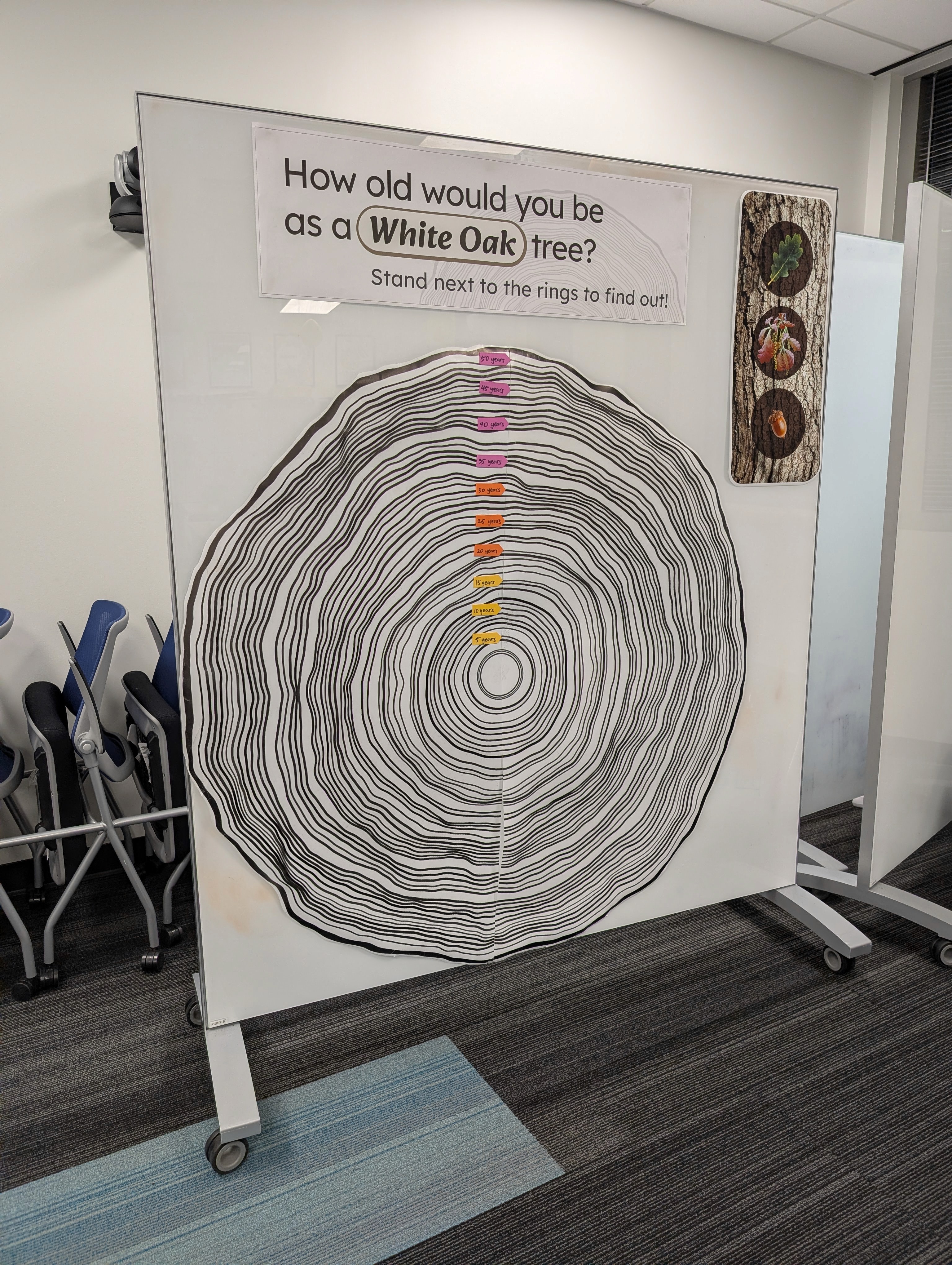 A vertical measure that compares a child’s height to tree rings, estimating their "Tree Age." The sides feature tactile samples of fruit and leaves.