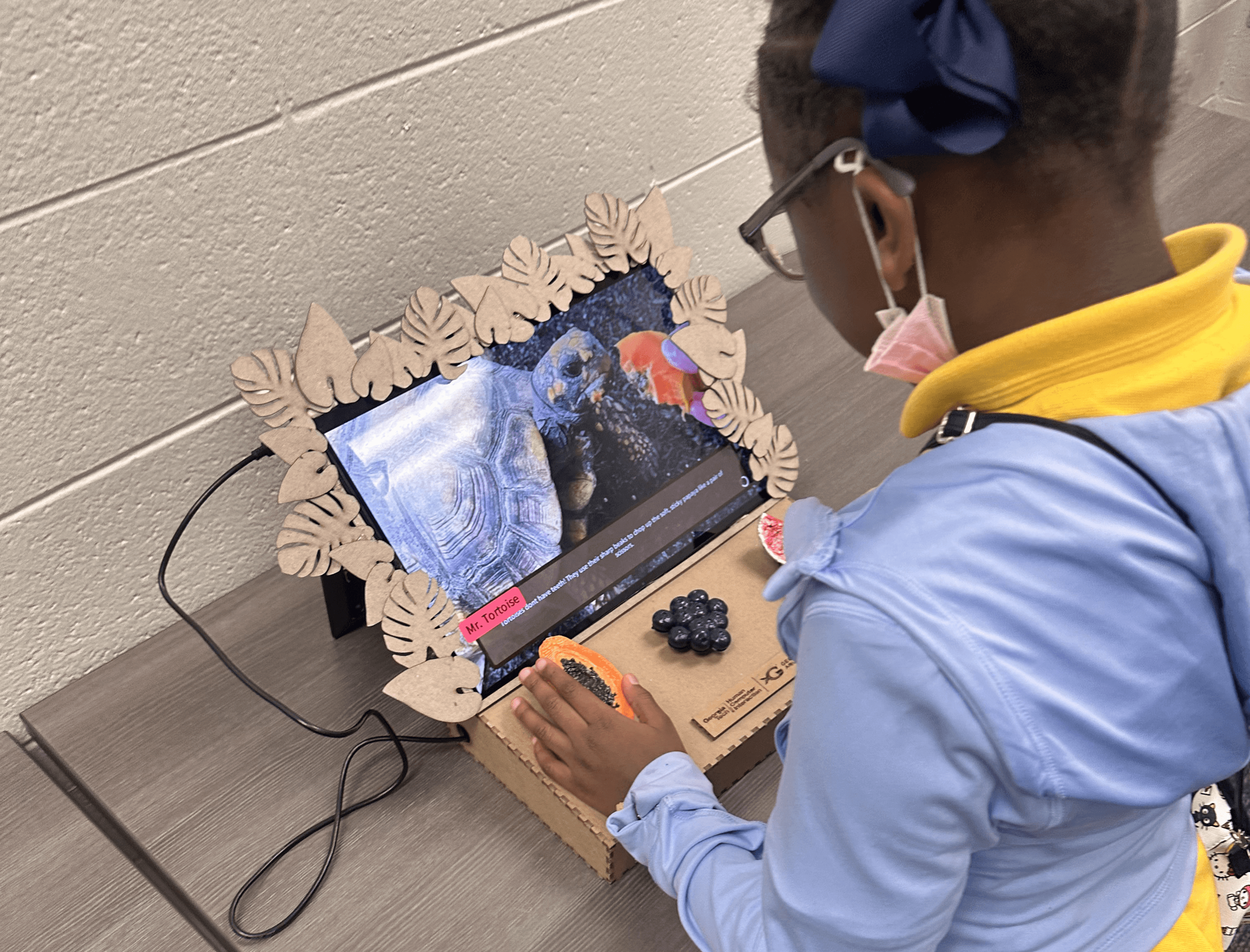 A digital display controlled by life-sized, physical fruit buttons. Children guess an animal's diet; correct guesses trigger a video of the animal eating, while incorrect guesses provide gentle, instant audio correction.