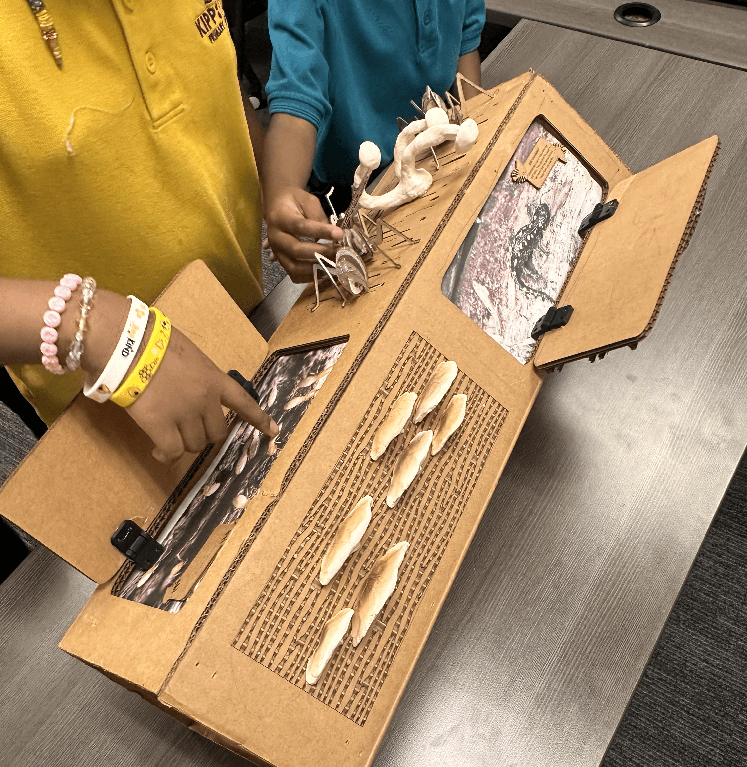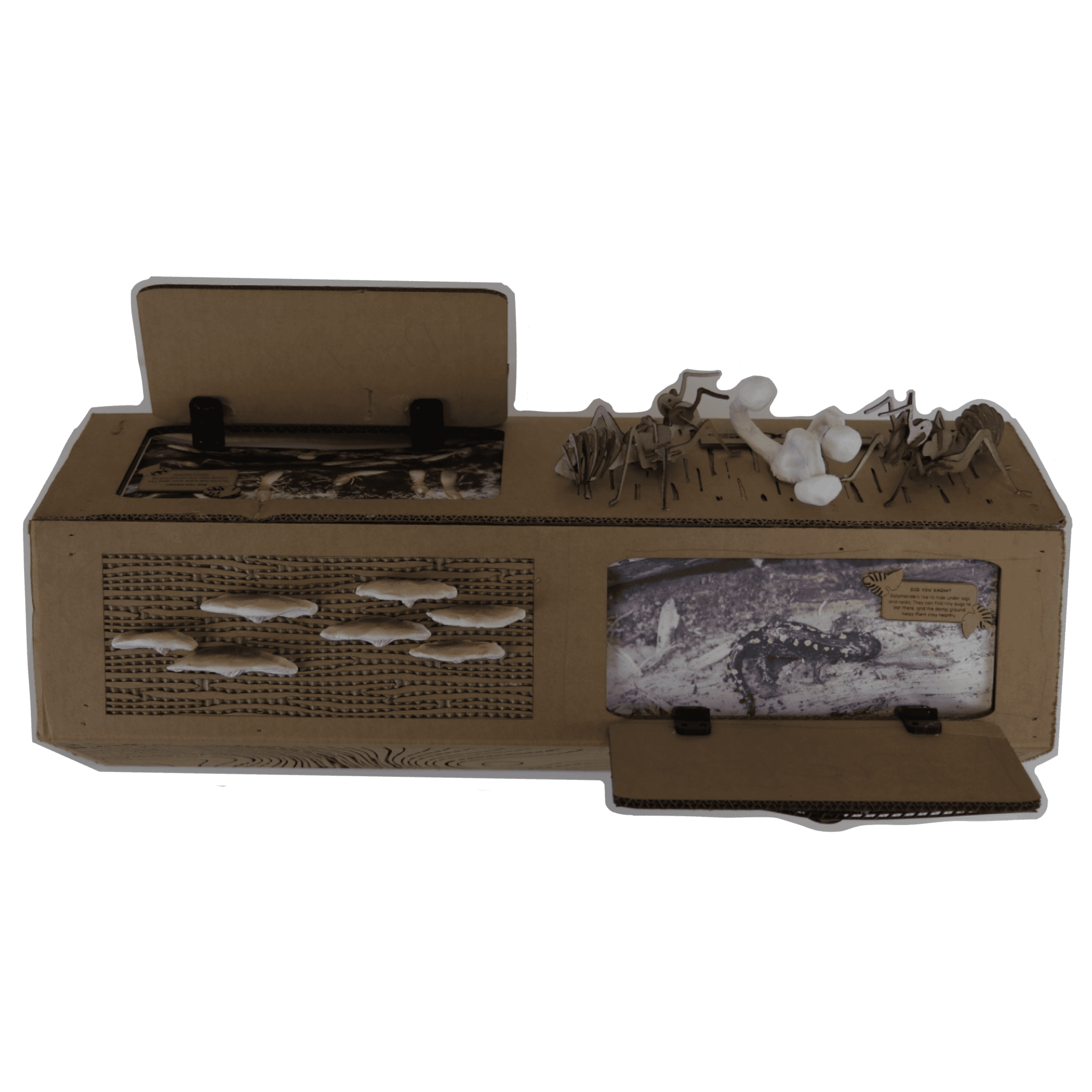 A physical model of a decaying log featuring openable doors revealing mushrooms, termites, and decomposers.